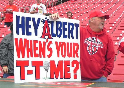 The Cardinals lost one of the greatest hitters in their franchise’s history last winter, yet they still find themselves two wins away from returning to the World Series to defend their title. Albert Pujols is now an Angel, and the Angels are now mere spectators as four teams fight for a championship. Of course, that means St. Louis fans have to capitalize on the opportunity to harass the man who skipped town to fatten his wallet.