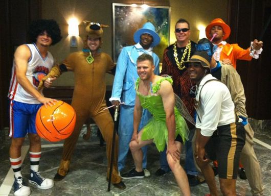 Chipper Jones is trying to squeeze every last inch out of the final season of his 18-year MLB career. If that means joining the rookies and dressing up like a moron, so be it. As you can see from the photo above that Braves pitcher Peter Moylan shared on Twitter, the Braves made their rookies dress up in dumb Halloween costumes recently and Chipper joined them.