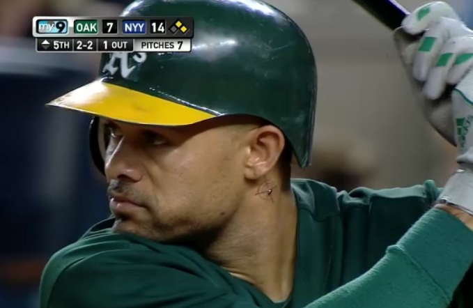 I must be out of the Coco Crisp loop because I had no idea he had this thing in his neck. Watching the Yankees-A’s game on Friday, the announcers focused on it and were astonished MLB allowed him to play with it in. To be truthful, it’s hard to figure out exactly what it is. Is that a bullseye? A bee bee stuck in his neck? Is it supposed to mimic someone spotting him with a scope and hunting him down? I don’t know what it is, but I think we can all agree it looks pretty awful. Maybe he should just stick with awesome ‘fros if he wants attention.