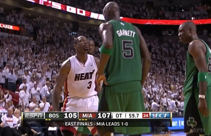 Wednesday was an embarrassing night for Kevin Garnett. The 36-year-old forward went 6-18 for 18 points in an Eastern Conference finals Game 2 loss to the Heat. He let Dwyane Wade score a layup in front of him to essentially seal the game in overtime, and he was called out by Wally Szczerbiak on Twitter. As you can see in the image above, Wade stared back at KG hard after the layup.