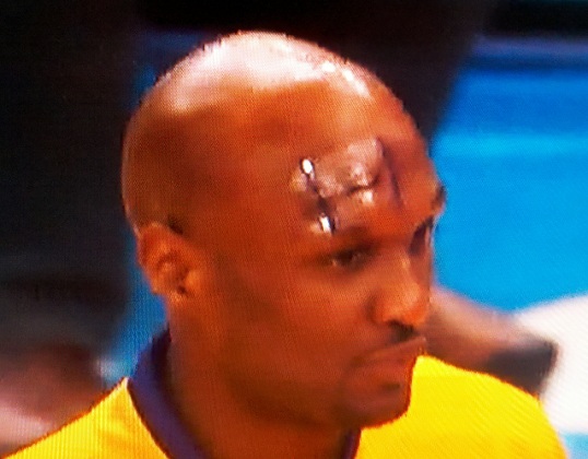 Sick of all the Mr. Kardashian jokes, Lamar Odom has apparently taken it upon himself to prove what a tough guy he is. After colliding with teammate Pau Gasol during Thursday night’s win over the Celtics, Lamar had a gash in his dome that needed to be examined by the trainers. They patched his head up with a bandage and he returned to score six points and grab six rebounds in the fourth quarter of the game. After his tough guy display was over, Odom got eight stitches on his dome, and then he got patched up for Friday’s game.