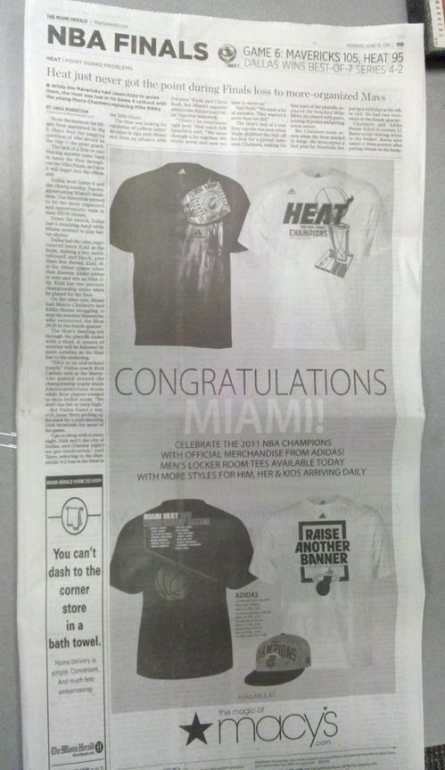 For the second year in a row, there was a mistake involving an advertisement by a department store that ran in the newspaper after the NBA Finals ended. Last year, it was this mistake by JC Penney. This year, it was this mistake by Macy’s as shown by the Miami New Times: