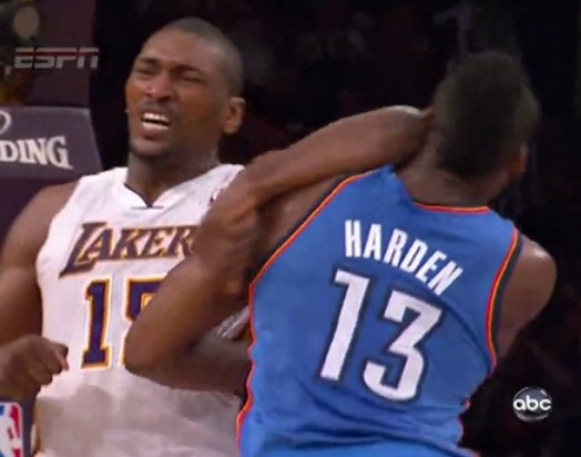The Lakers moved on to face the Thunder after beating the Nuggets in the first round of the playoffs, but don’t expect too many hugs and kisses to be exchanged between the squads. Monday’s Thunder-Lakers game will mark the first time Metta World Peace faces James Harden since giving him a concussion with an elbow to the head last month. World Peace was asked after Saturday’s Game 7 win if he plans to shake Harden’s hand, and he didn’t exactly offer an olive branch.
