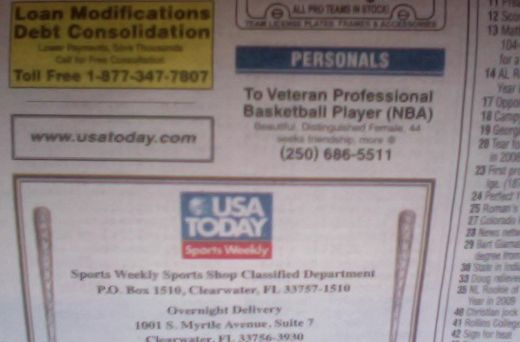 Now that he’s recently retired, my Dad has a lot more time on his hands for sports reading so he just began subscribing to USA Today Sports Weekly (in addition to the existing SI, Sporting News, and Baseball Digest magazines, of course). When he gets done with the mags, he passes them on to me and they join my hearty collection of sports-related restroom reading. While flipping through the Sports Weekly from two weeks ago, I noticed the most curious add. Here I was thinking that NBA groupies had progressed to twitter but apparently I was wrong. Very wrong. Check out this personal ad appearing to the left of the sports crossword puzzle: