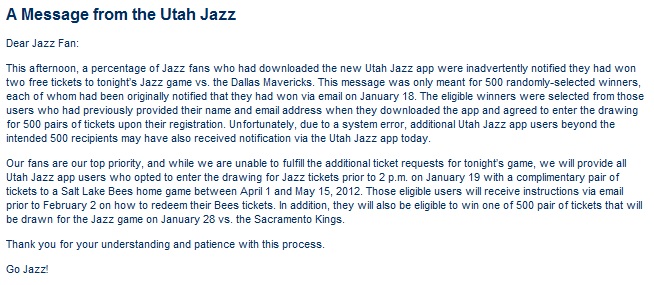 A major blunder by the Utah Jazz has left some of its fans angry. According to the Deseret News, all fans who entered a mobile app drawing for free tickets to the Jazz-Mavericks game last Thursday received a notification telling them they had won. The problem is that message was sent in error and only a certain number of the fans received the tickets.