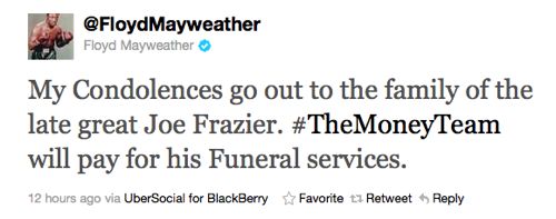 Floyd Mayweather Jr. has more money than he knows what to do with — literally. We love to make fun of the fact that he is constantly spending his millions of dollars on unnecessary luxuries and gambling millions at a time on football games and other sporting events. Since we heckle him for spending money on things that we perceive to be dumb and obnoxious, we might as well give him credit when he offers to use it generously. As Black Sports Online pointed out, Mayweather offered to pay for Joe Frazier’s funeral services. He made the announcement via Twitter Monday night.