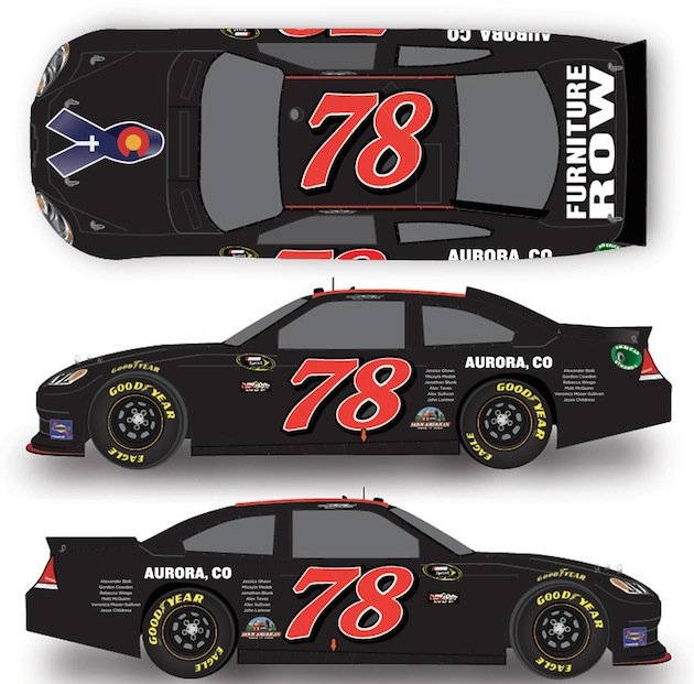 Among the design features on the black Chevy’s exterior are a blue ribbon on the hood, “Aurora, CO” and the names of the 12 victims on the rear quarterpanels, and the message “For Those Lost, Those Injured and Countless Acts of Bravery 7/20/12” on the back. Smith’s team, Furniture Row Racing, is based in Denver.