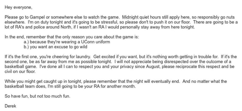 In anticipation of the big game, a UConn RA named Derek sent the letter you see above to the students who live on his floor telling them he is not going to tolerate any type of excessive celebrating. He also basically called everyone bandwagon fans and said the only reason they care about the game is because the uniforms say UConn or they want an excuse to party.