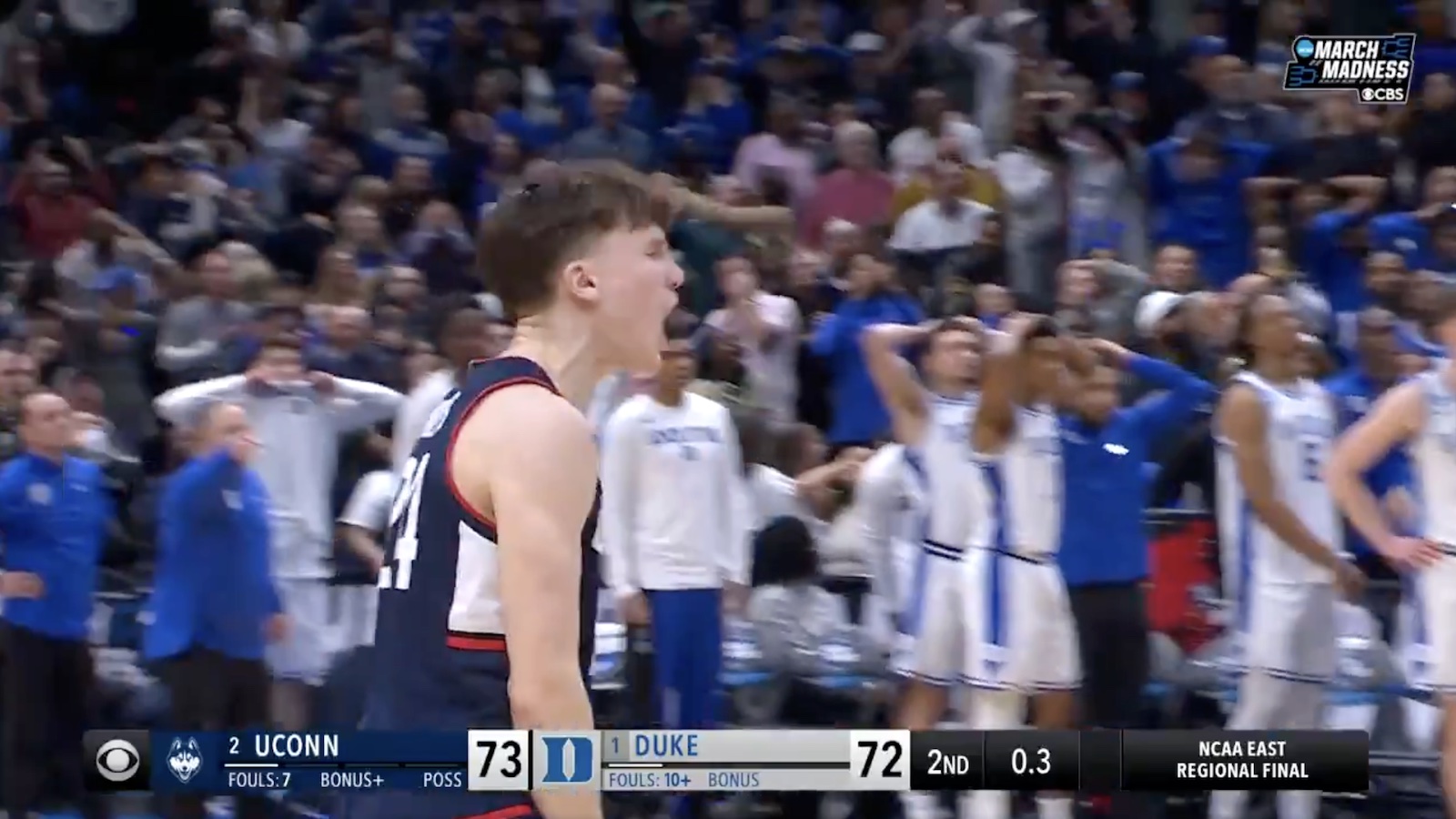 1-seed Duke looked like they had a win in hand over 2-seed UConn, holding a 72-70 lead and possession with 10 seconds left at Capital One Arena in Washington, D.C. All the Blue Devils needed to do was take care of the basketball and the Final Four berth on the line was theirs.