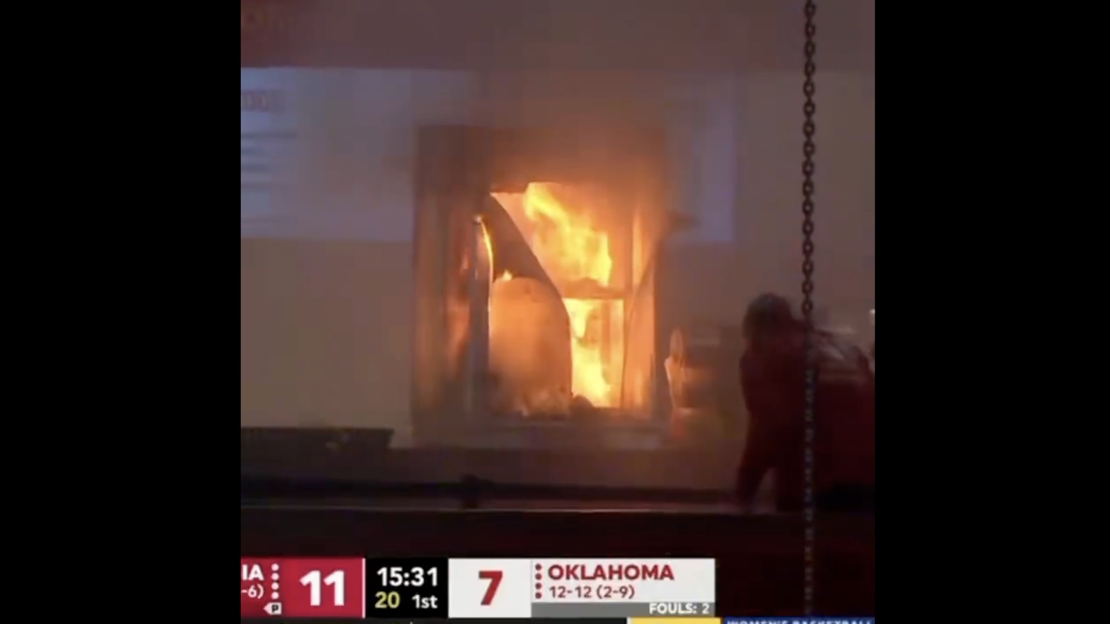 The fire was put out by the venue’s emergency sprinkler system, which drew praise from Oklahoma head coach Porter Moser.