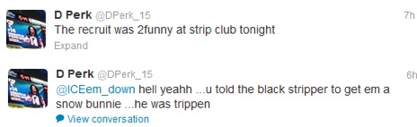 First off, you’re not supposed to take recruits to a strip club if you’re trying to abide by NCAA rules. I get that not everyone is following the rules, so stuff like this is to be expected. But man, how dumb do you have to be to actually tweet about it? Apparently these youngsters don’t understand that Twitter is a public medium and that tweeting about something is like telling reporters about it. Don’t these guys have instant messenger or text messaging capabilities when they want to reminisce about stuffing $20 bills in Heather, Hope and Tiffany’s g-strings.