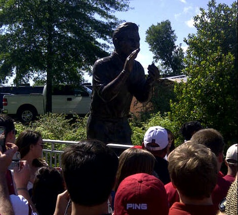The statue was unveiled in front of a reported 92,310 estimated crowd that attended the annual spring game known as A-Day. The crowd was about as large as Saban’s first year on campus in 2007, and barely beat the attendance last year. I guess the exception for a lack of passion amongst Bama fans was ’08 when only 78,000 people showed up for A-Day.