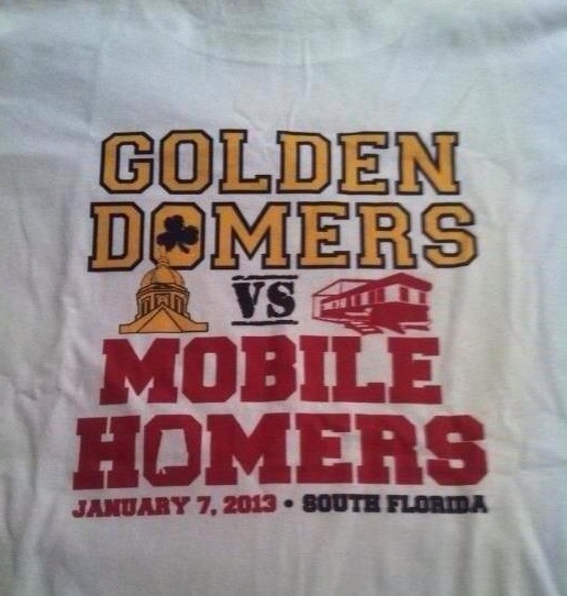 Last week, we shared this shirt that got Jimmy Clausen in trouble. This week, it’s a Notre Dame fan shirt that calls the Irish “golden domers,” and Alabama supporters “mobile homers.”