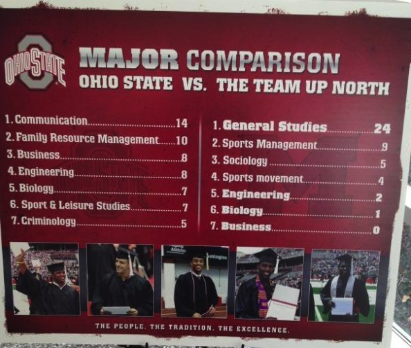 What you’re looking at here is a poster recently seen in the Woody Hayes Athletic Center on Ohio State’s campus that compares the majors chosen by players on the OSU and Michigan football teams. The sign is meant to condemn “The Team Up North,” as per Urban Meyer’s crusade against calling the school by its actual name, for its players not challenging themselves with academic rigor. Evidently, 24% of Michigan football players majoring in “General Studies” is extensively worse than the same amount of Buckeyes players majoring in “Communication” or “Family Resource Management.” But who are we to judge?