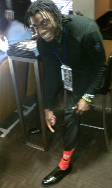 Robert Griffin III loves his themed socks. At first I thought he used his socks as a means of gathering more attention, but now I’m convinced he just likes rocking childish stuff on his feet. We all remember the Superman socks RG3 busted out at the Heisman Trophy presentation, and now he as spotted at the Sugar Bowl rocking some Elmo socks. Check out this picture that Georgia tight end Aron White shared on Twitter:
