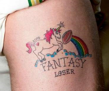 The Omaha World Herald has the story of Spud Mann who finished last in his fantasy league and had to get a tattoo agreed upon by the other nine members of the league. Here’s what they came up with: