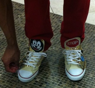 We were already used to seeing him wear red pants, crazy shirts, and nerd glasses, so the kicks were a new touch.