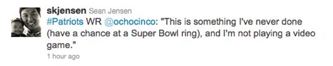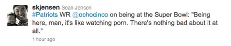 As we mentioned earlier, there have been very few quotable moments over the past week-and-a-half as we await the arrival of the Super Bowl. Tuesday’s media day was highlighted by a jovial Bill Belichick and one of his receivers saying he thinks Bill is happy because of his girlfriend. Believe it or not, that receiver was not Chad Ochocinco. In fact, many members of the media were disappointed with Chad’s serious demeanor on Tuesday. As Sean Jensen of the Chicago Sun-Times shared with us on Twitter, Ocho redeemed himself at Wednesday morning’s media session.