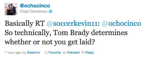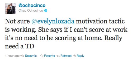 However, we could see some serious frustration coming from Ochocinco if he doesn’t find the end zone soon. As our friends over at The Nosebleeds pointed out, Chad says his fiancee Evelyn Lozada has refused to have sex with him until he can score a touchdown for the Patriots. Check it out: