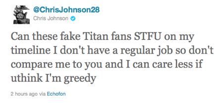 Depending on how closely you have followed the NFL offseason, you may have heard something by now about a guy named Chris Johnson. Johnson, who has rushed for 4,598 yards in just three seasons with the Tennessee Titans, wants more money. The Titans are reportedly working on it and want to make Johnson an offer that will satisfy him and get him to camp. In the meantime, C.J. is tired of hearing from Titans fans on Twitter.