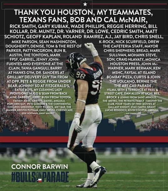 However, the former second-round pick did things a bit differently than most. We have seen full-page ads thanking the fans and even heartfelt hand-written letters. But to my knowledge, no athlete has ever taken the time to thank the delivery guy, his cleaning lady, the popcorn guy and cheesecake. Those were just a few of the bases Barwin covered in his thank you letter to the Houston area.