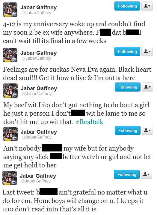 Jabar Gaffney’s marriage does not seem to be in a good place if the tweets sent from his verified Twitter account are any indication. Thursday was apparently his anniversary with his wife, but he says she was not around. He also recently sent a nasty tweet about free agent cornerback Lito Sheppard, who is his cousin. Gaffney seemed to indicate his beef with Sheppard is separate from his marital issues with his wife, but who knows. Below is a censored version of the angry tweets sent from the wide receiver’s Twitter account Thursday: