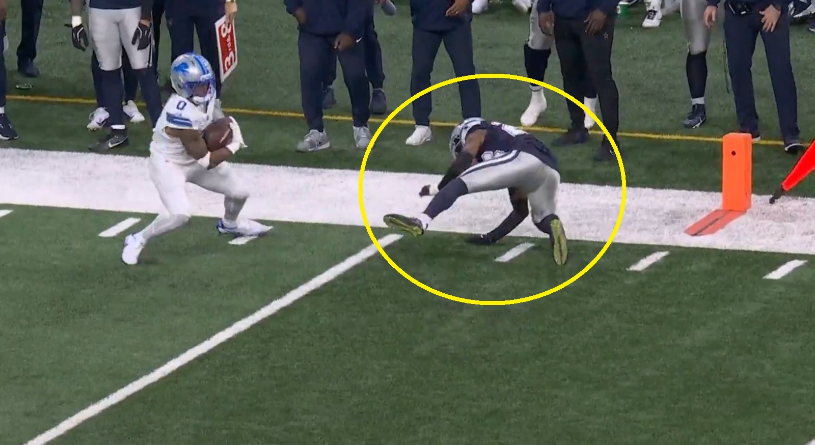 On a 3rd-and-8 play from the Lions’ 34-yard line, Gibbs got loose for a short completion by the Dallas sideline. He then hit the brakes and changed directions, leaving Bland (who was in hot pursuit) to cruelly touch earth.