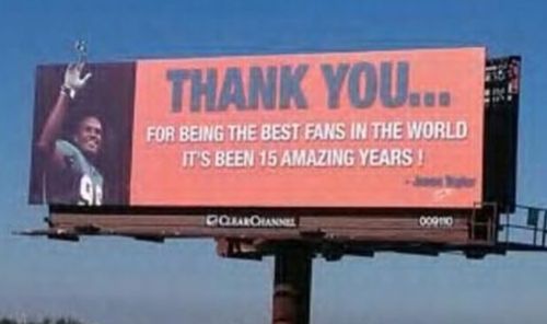 Billboards have managed to withstand the test of time through the internet and new media generation. Sometimes they work and other times they don’t. Some billboards are just for fun while others result in a player being fined for something he didn’t do. In any event, this is a classy move by one of the NFL’s all-time great defensive ends.