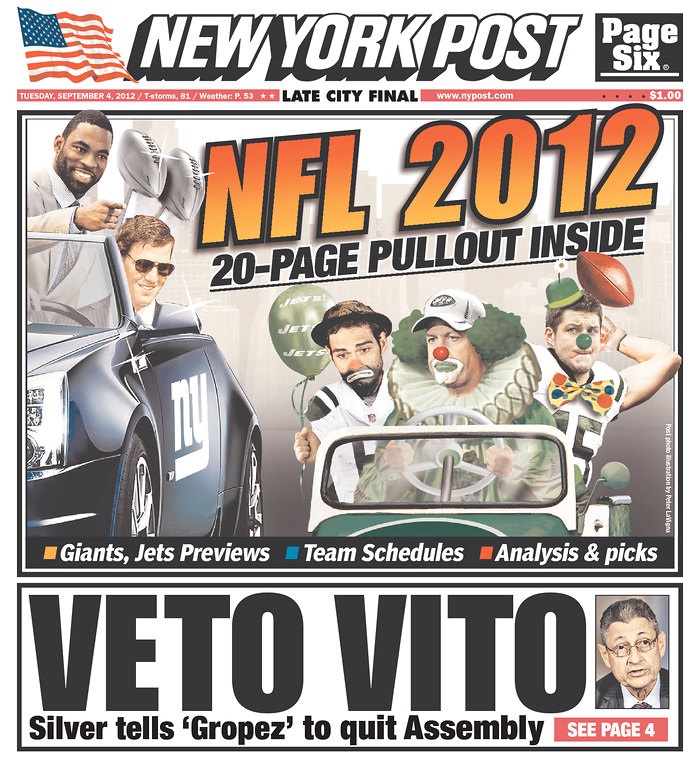The New York Post is known for stirring things up with their newspaper covers, and they truly outdid themselves on Tuesday. In their NFL season preview, they put New York Jets quarterbacks Mark Sanchez and Tim Tebow in a clown car being driven by coach Rex Ryan. Giants stars Justin Tuck and Eli Manning are seen cruising by in a convertible with the top down, holding their two Super Bowl trophies.