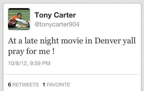 After returning home to Denver following a loss to the Patriots, Carter apparently decided to enjoy his day off by catching a movie. At some point he had a horrible lapse in judgment and thought his Twitter followers would find it humorous if he made a joke about the tragic shooting that occurred at a movie theater in Aurora, Colo. over the summer. The tweet, which has been deleted, was captured by Denver Sports Nation’s Adam Kinney: