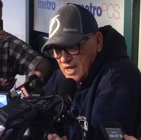 Boucher shooting the first pitch at the Rays game continued the strong relationship between the teams. Last year, some Lightning players took batting practice with the Rays. Before the game, Rays manager Joe Maddon showed his support of the Lightning by wearing their cap: