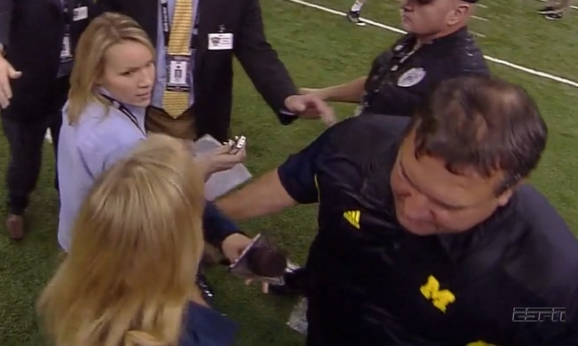 Media members beware: You come between ESPN reporter Holly Rowe and her interview subjects, and she will hit you with the elbow of death. One journalist presumably looking for a post-Sugar Bowl victory quote from Michigan coach Brady Hoke learned that the hard way. Observe the video: